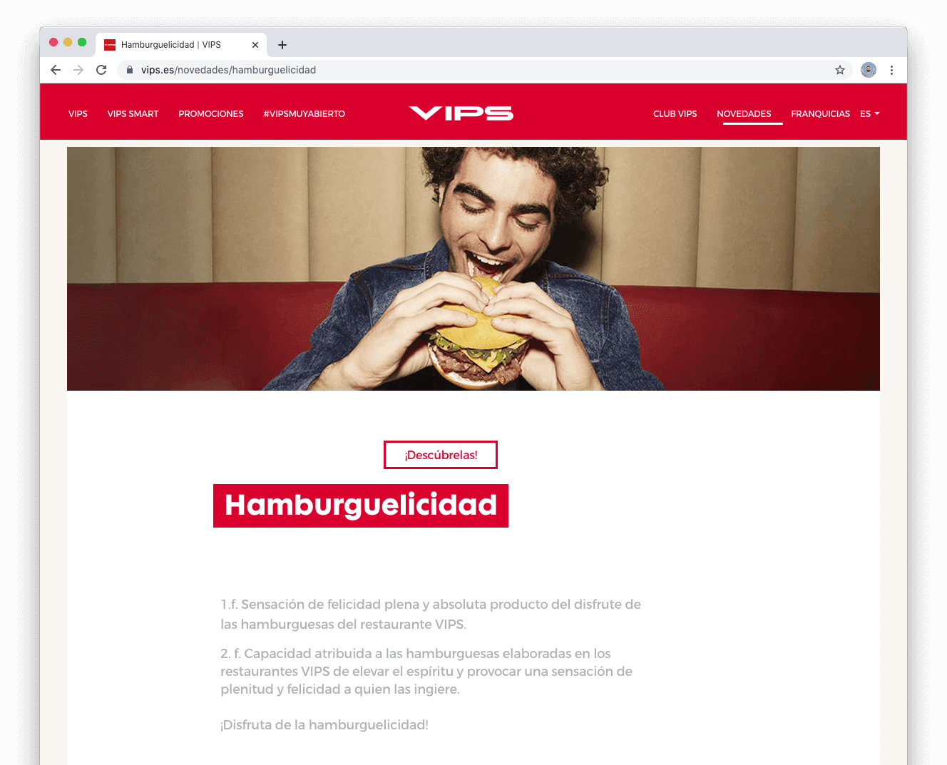 ¿Necesitábamos una palabra que describiera cómo nos sentimos al comer una hamburguesa? En VIPS creen que sí, y ahora puedes sentir hamburguelicidad. Según su propia definición: “La sensación de felicidad plena y absoluta producto del disfrute de las hamburguesas del restaurante VIPS”. Para crearla, han unido las palabras hamburguesa y felicidad.